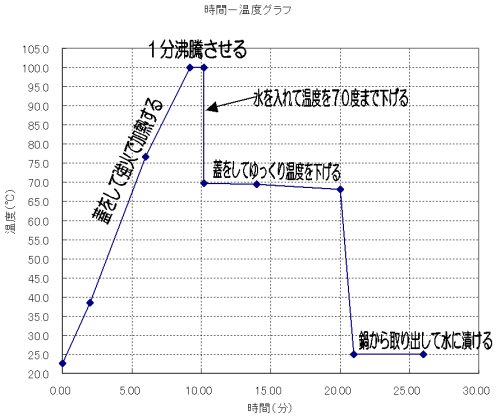 まず、経験的には、小さめのお鍋で水から卵を茹で、沸騰したら火を止めて、蓋をしたまま(ゆっくり温度が下がる)2〜3分放置し、その後蓋を外して(急速に温度が下がる)食べごろの温度になったら取り出すという方法で、気候や鍋の大きさによっては、美味しい半熟卵が出来ることが分かっていました。 しかし、気温やお鍋の大きさ、卵の個数が変化すると、この方法は失敗することが多く、運任せなところがあります。 そこで、温度を測りながら茹でて、どのように温度を変化させれば、失敗無く美味しい半熟卵ができるか調べたのでした。 |