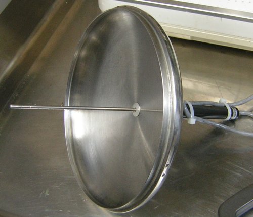 | 鍋蓋に温度計プローブを取り付けたところです。差し込んでいるだけなので、必要に応じて着脱できます。 |